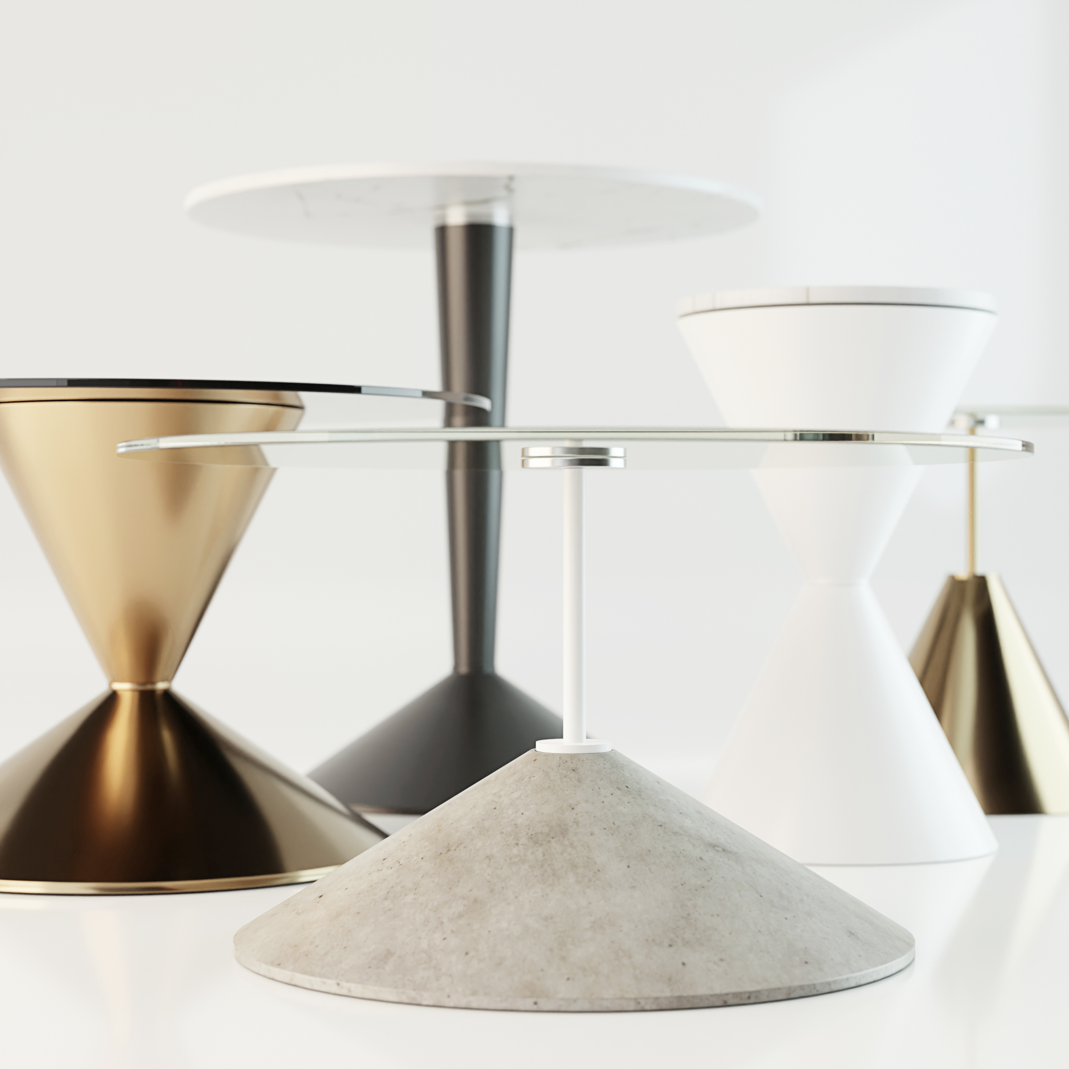 A vibrant and versatile collection of conical based tables: coffee, side, bar. Utilising a mix and match assortment of tops and bases together with considered…